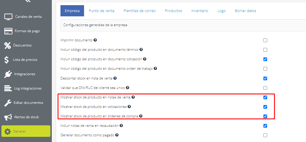 - Mostrar stock de producto en notas de venta: Active esta opción si desea visualizar el stock de cada producto en notas de venta.